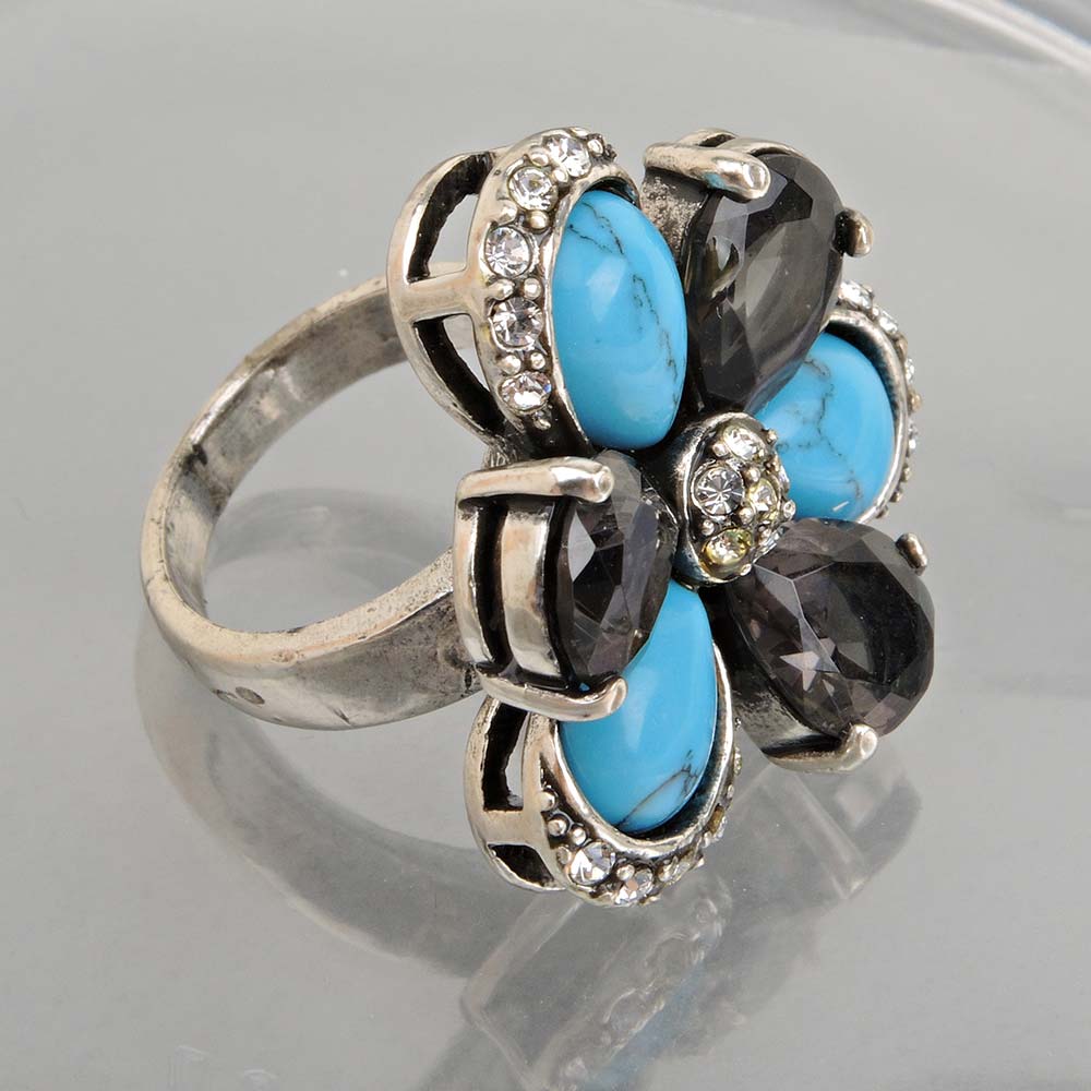 Кольцо чёрно-голубое с родиевым покрытием с прессованной бирюзой
