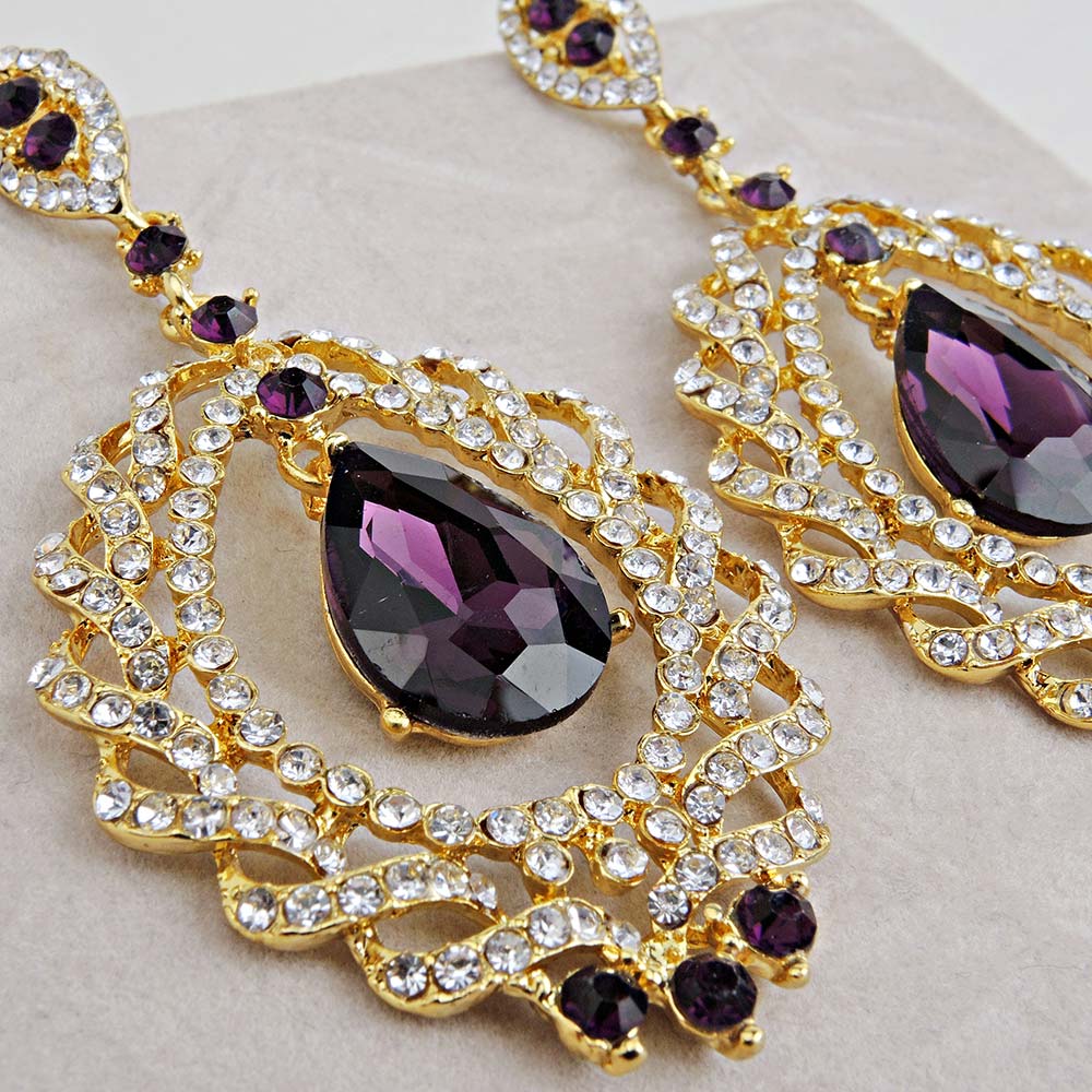 Серьги на гвоздиках фиолетовые с гальваническим покрытием под золото со стразами