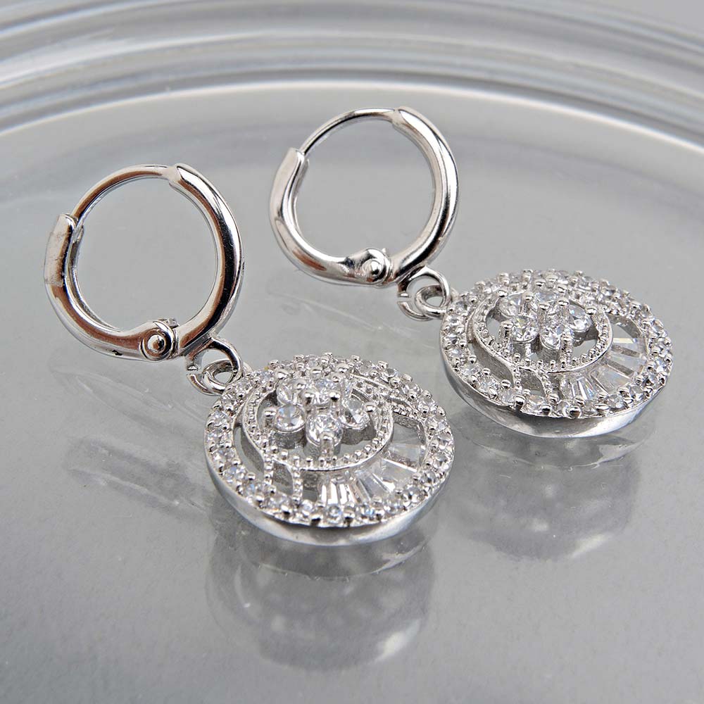 Серьги с замком кольцо свадебные белые с родиевым покрытием с цирконами (фианитами)